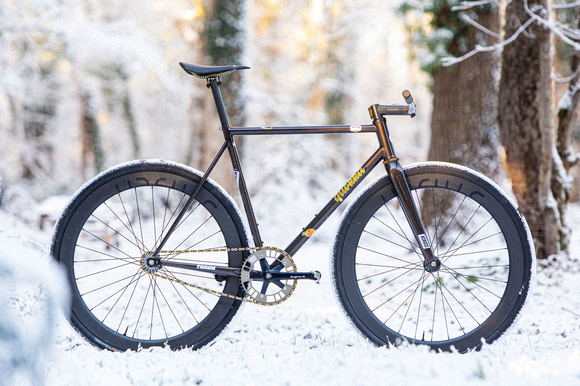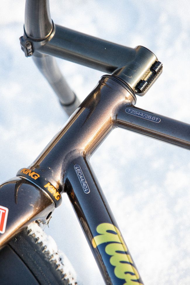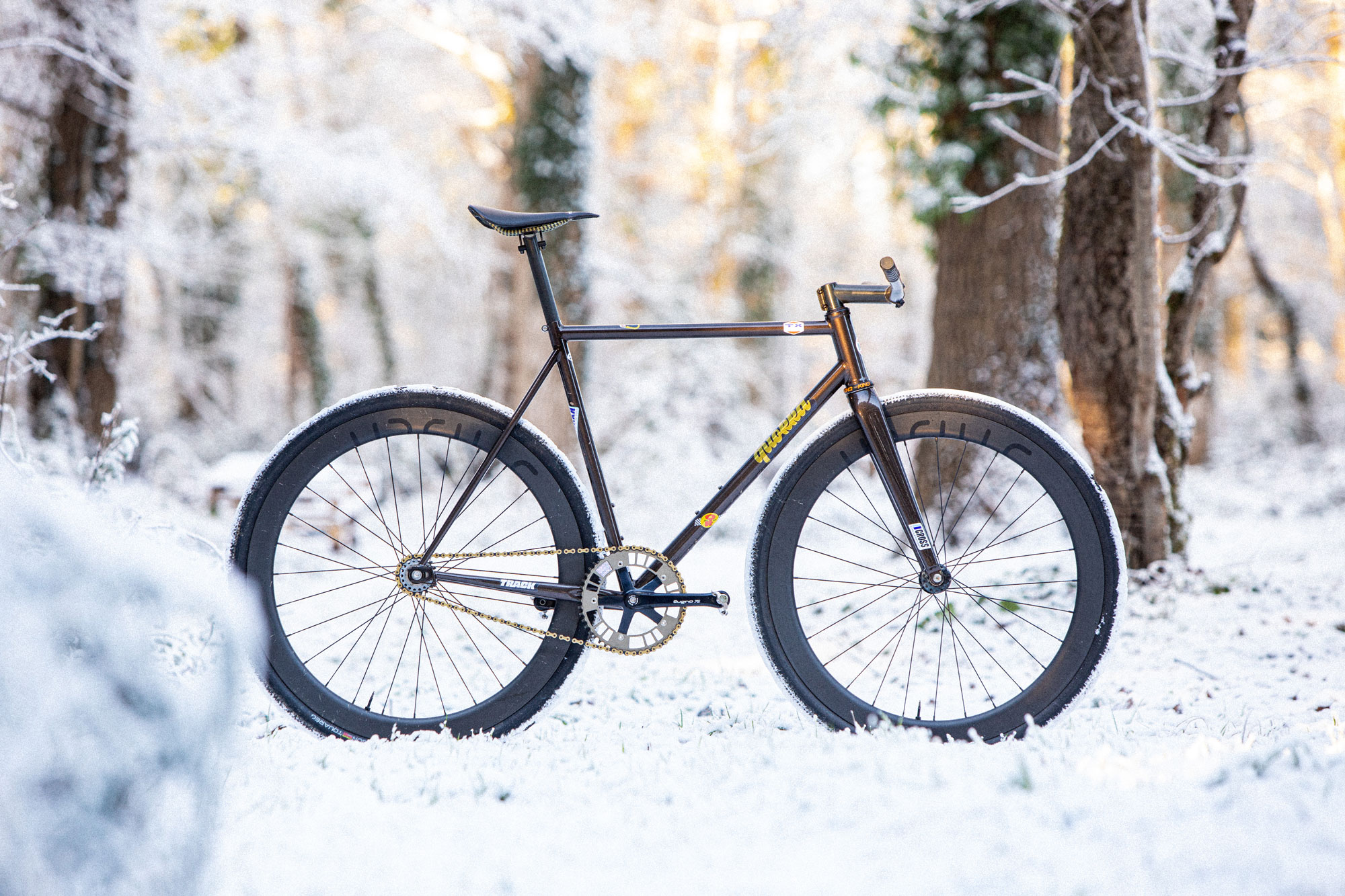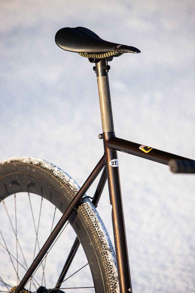 Le premier modèle CuZn est un pignon fixe, avec une géométrie agressive et qui accepte des pneus larges. Grâce à la fourche full carbone que nous avons co-développée, il accepte des pneus en 38mm à crampons en ayant de la place pour la boue.