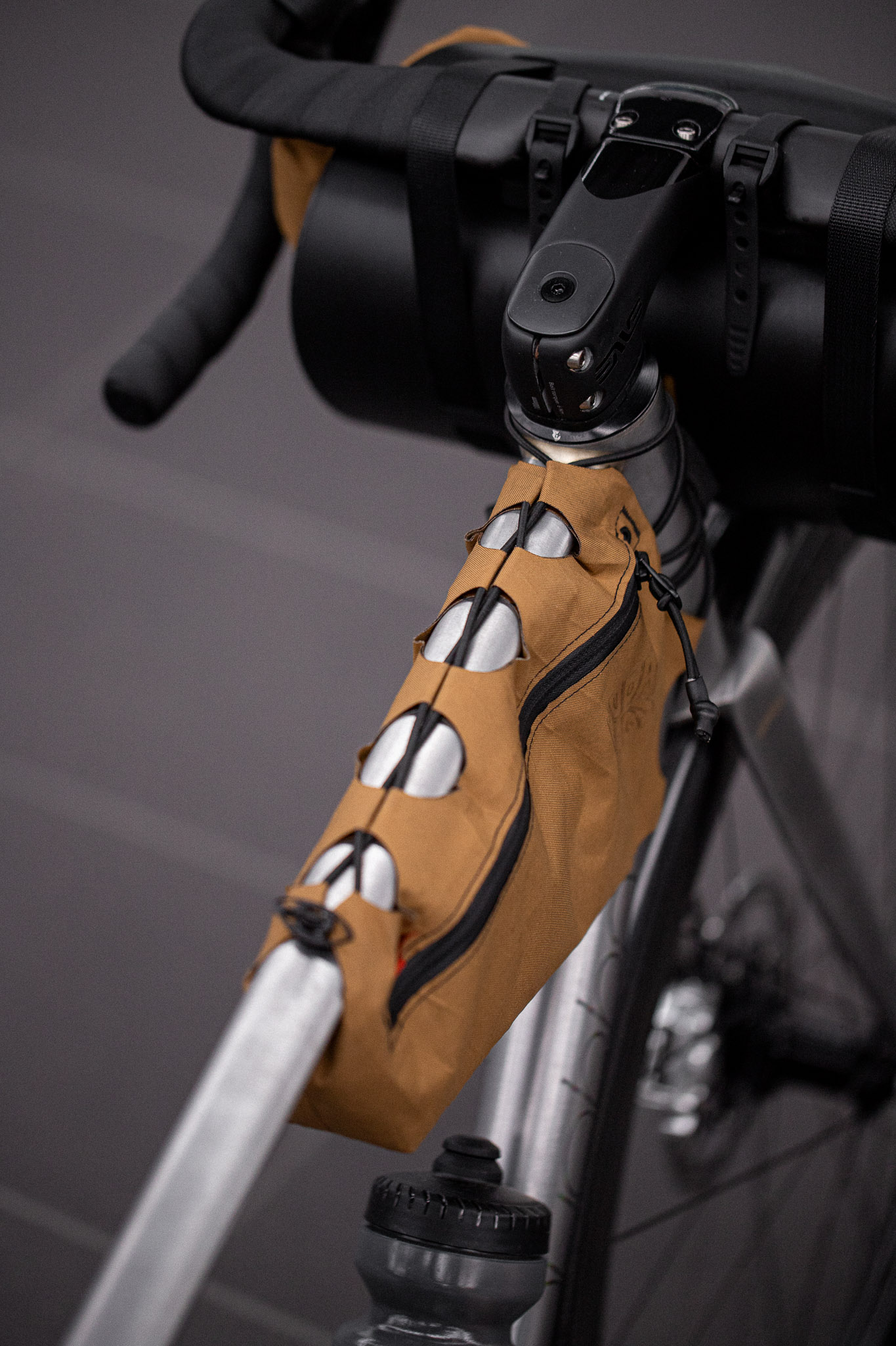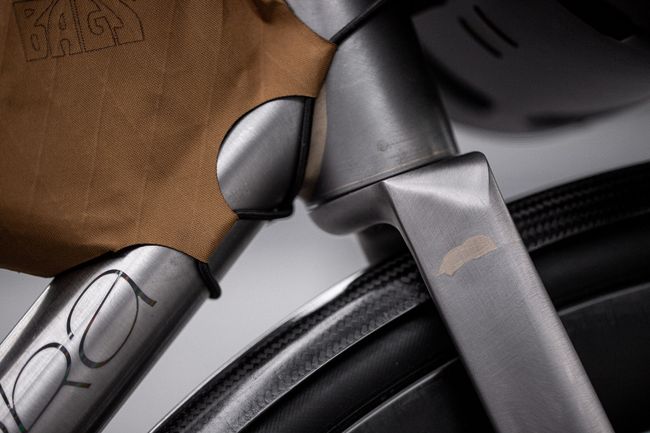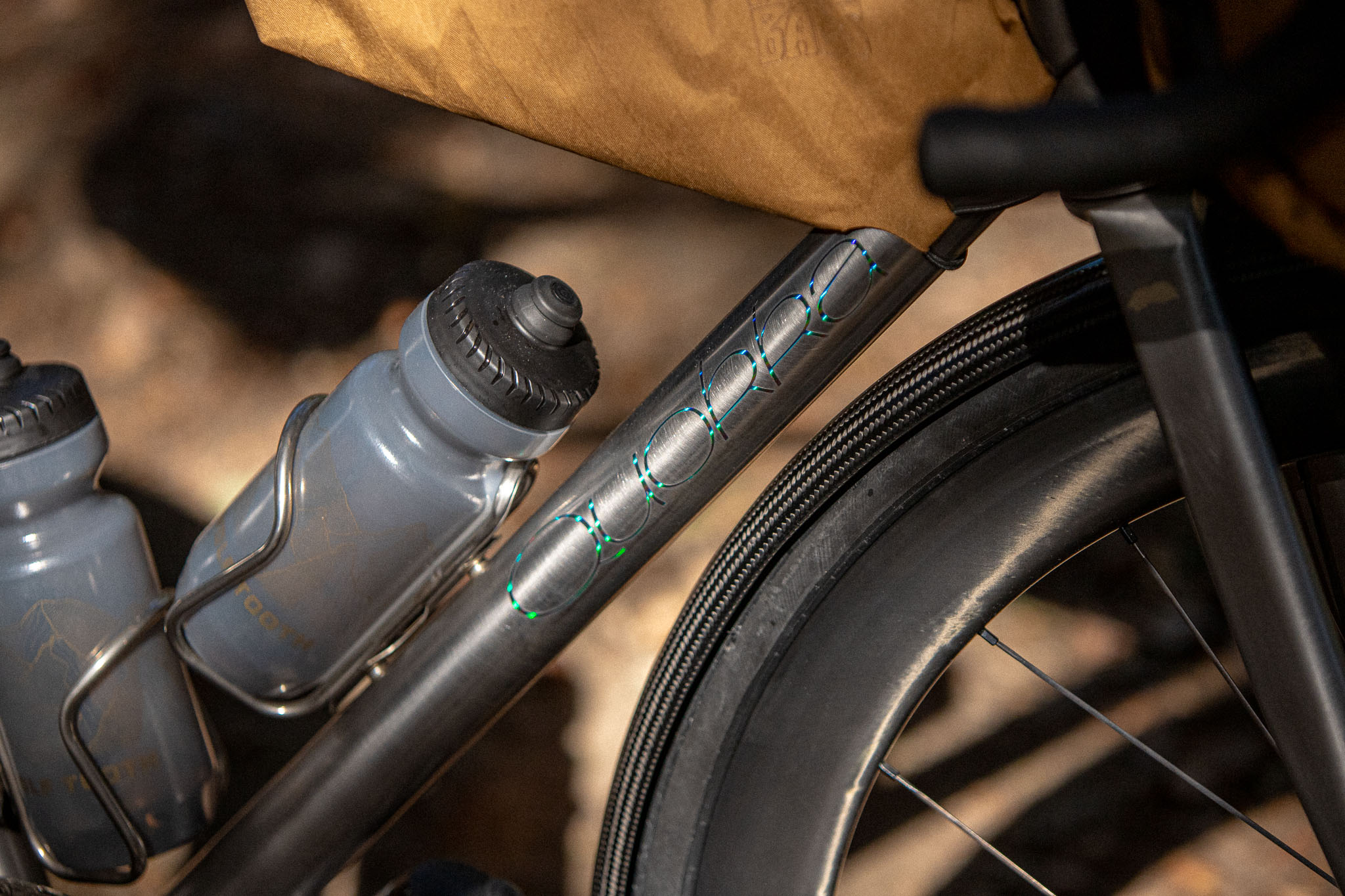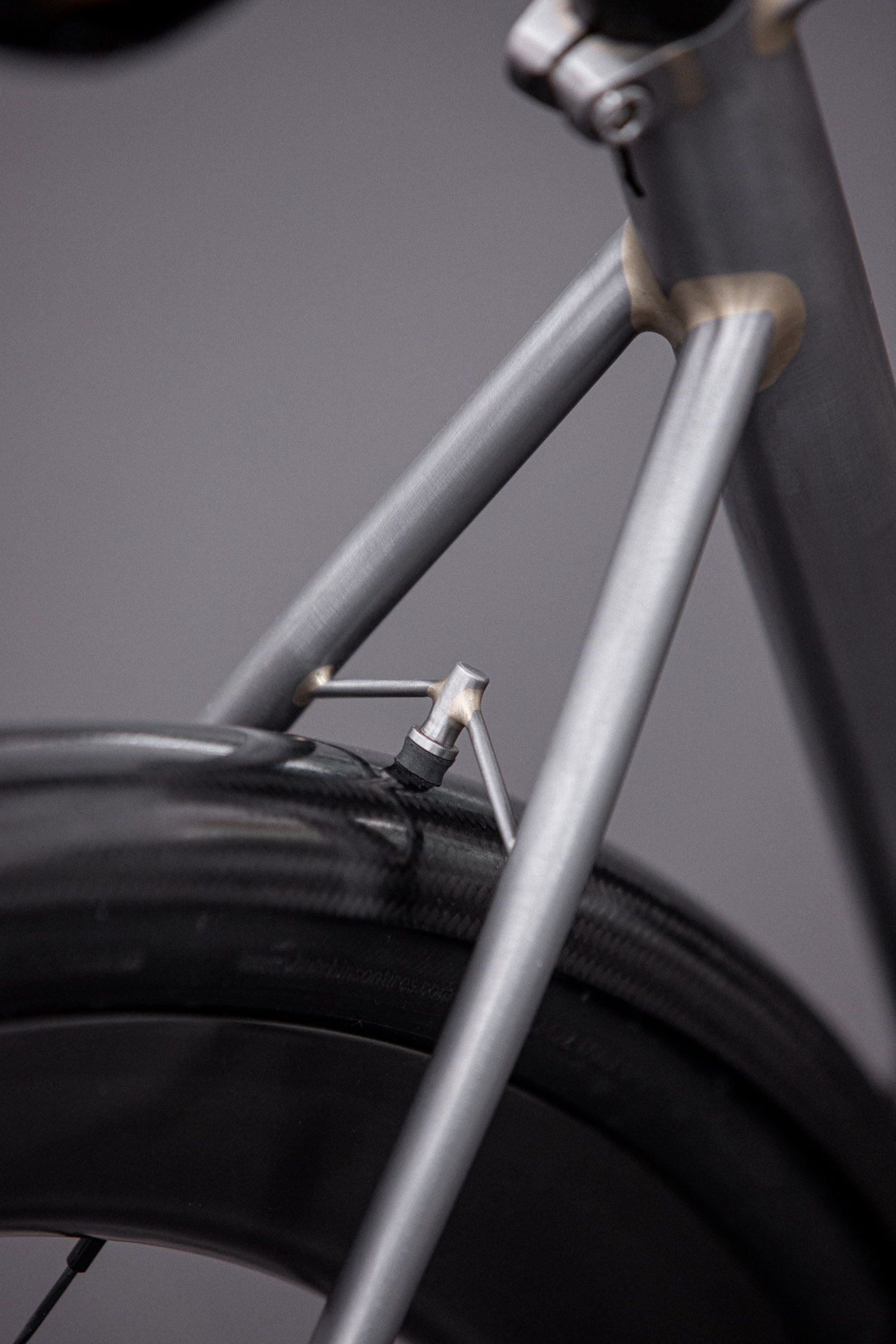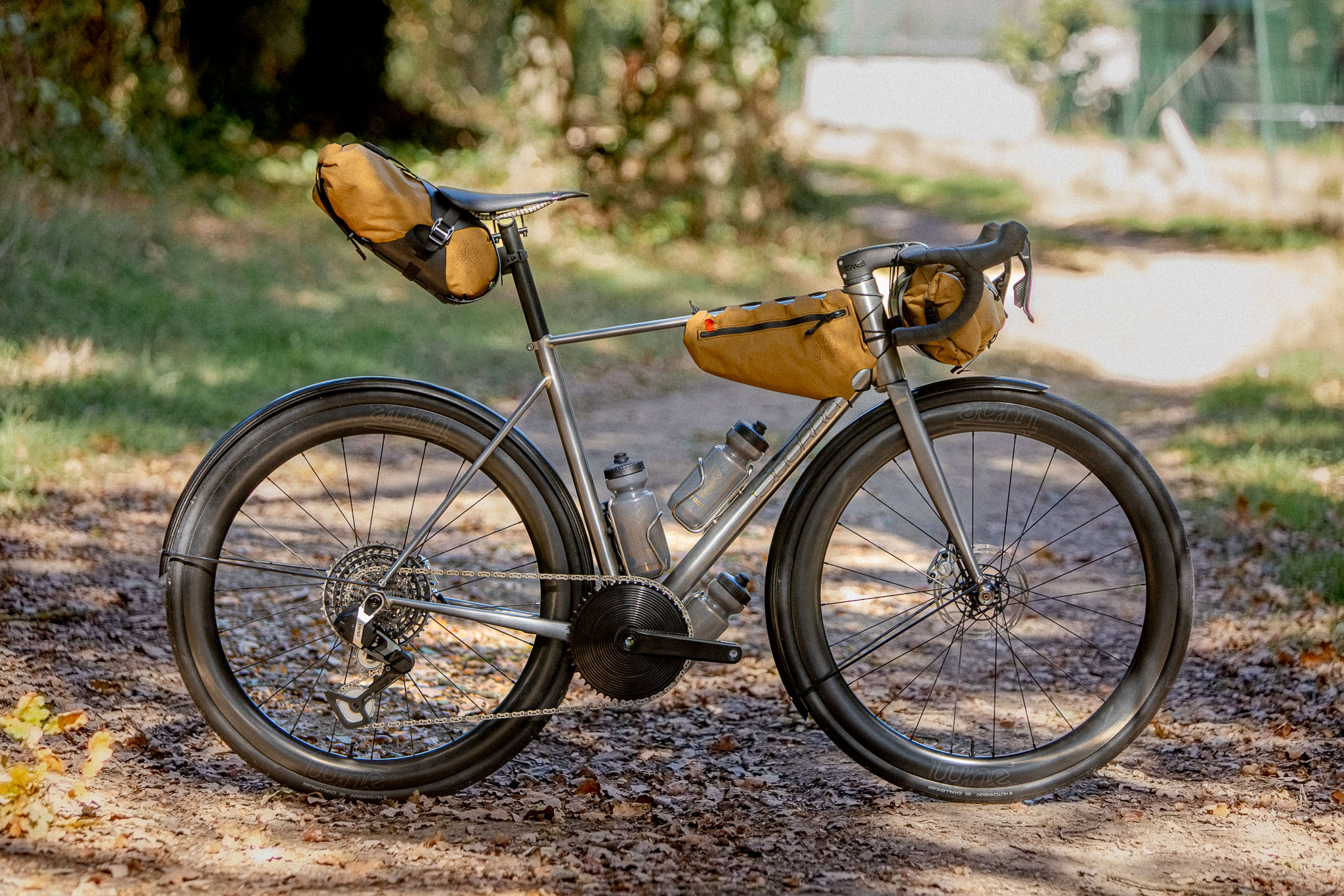 Après le franc succès que nous avons rencontré avec notre design conçu et présenter pour le salon Bespoked 2024, nous avons fait le choix de revenir cette année avec un vélo inspiré par ces lignes mais totalement repensé pour le confort et la longue distance. Pour aller vraiment à l’autre bout du spectre du vélo de piste, nous avons fait le choix de présenter ce vélo avec des garde-boue et un ensemble de sacoches bikepacking fabriqué par Moga Bags. Malgré sa fourche acier et ses nombreux équipements, le poids de ce vélo reste très contenu en affichant 9,8 kg sur la balance tel que sur les photos (sans peinture et sans pédales).