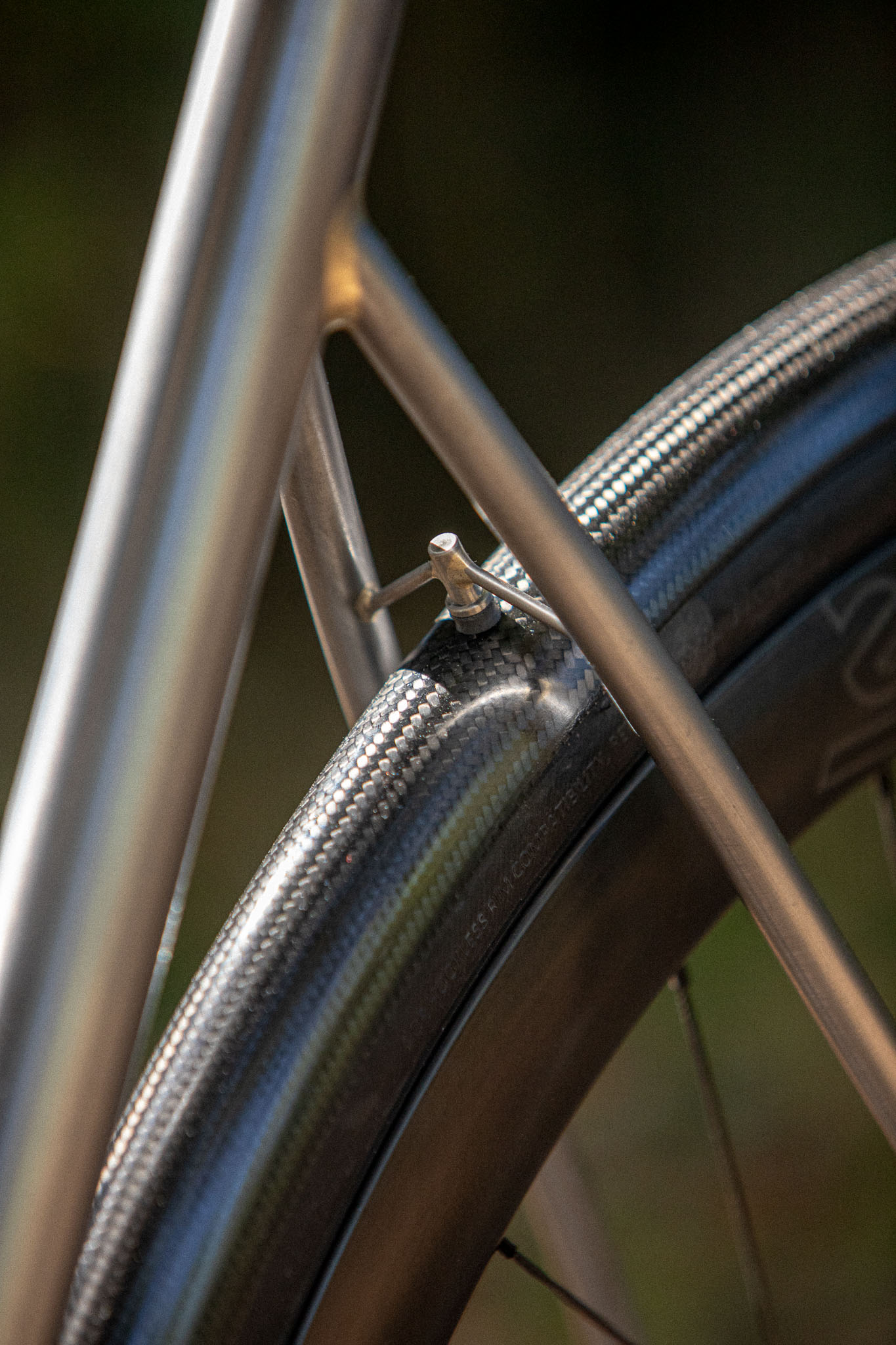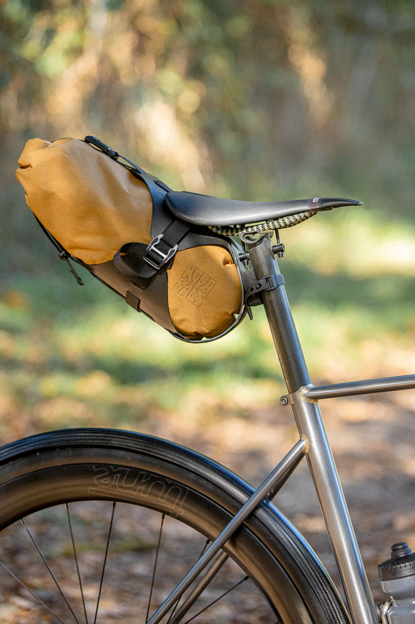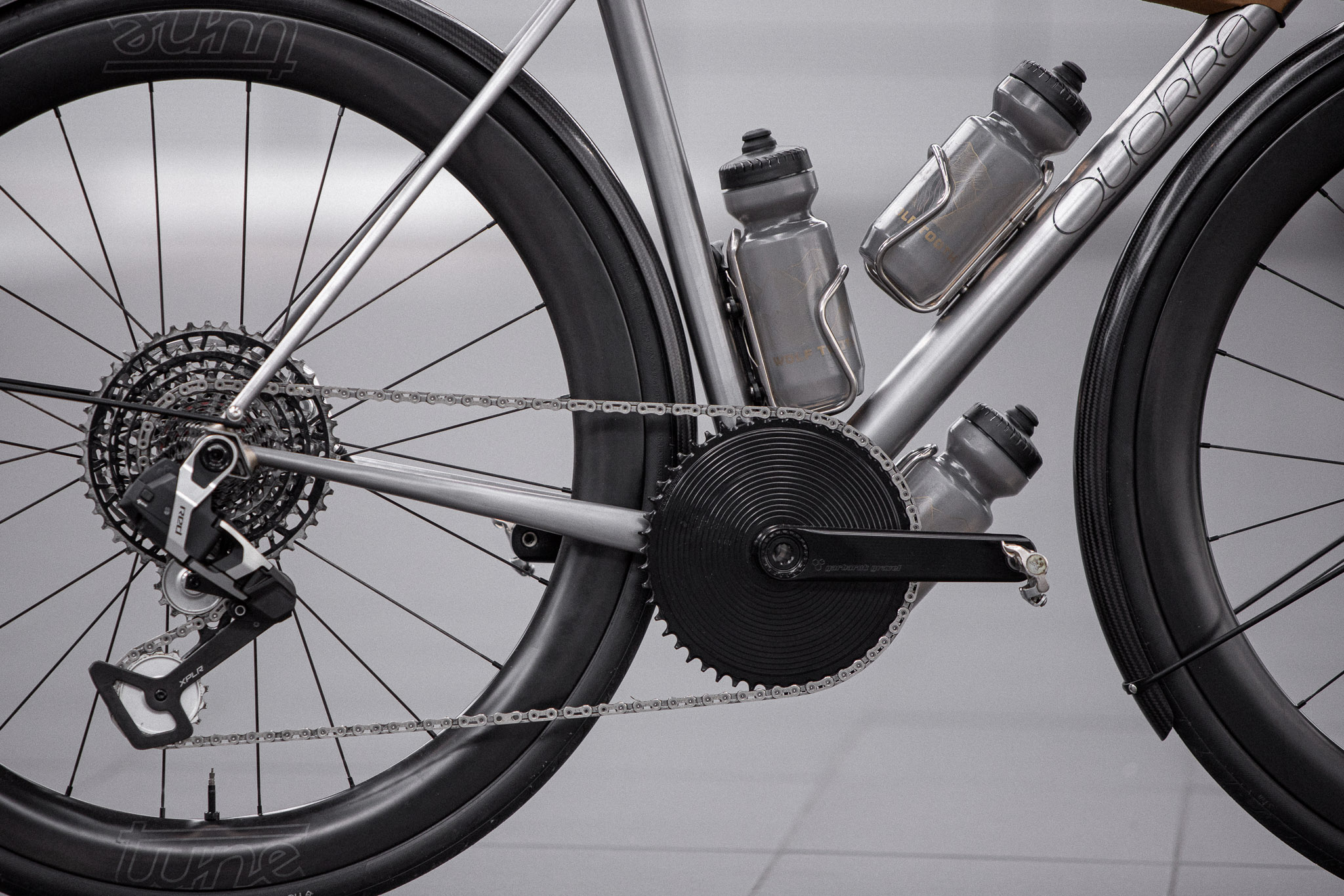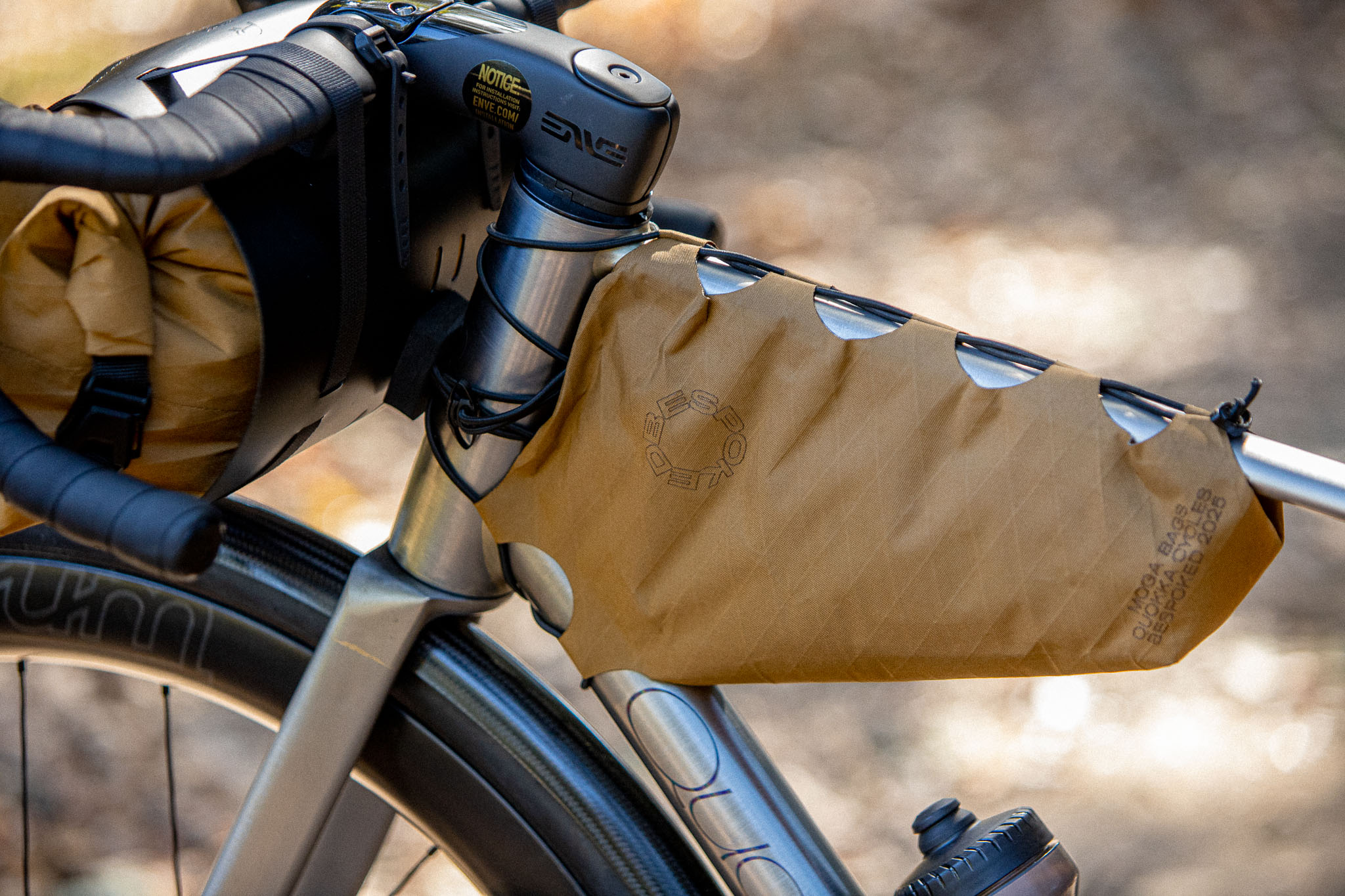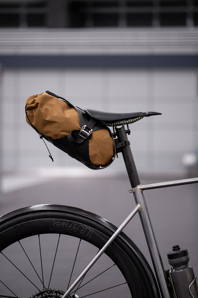 Après le franc succès que nous avons rencontré avec notre design conçu et présenter pour le salon Bespoked 2024, nous avons fait le choix de revenir cette année avec un vélo inspiré par ces lignes mais totalement repensé pour le confort et la longue distance. Pour aller vraiment à l’autre bout du spectre du vélo de piste, nous avons fait le choix de présenter ce vélo avec des garde-boue et un ensemble de sacoches bikepacking fabriqué par Moga Bags. Malgré sa fourche acier et ses nombreux équipements, le poids de ce vélo reste très contenu en affichant 9,8 kg sur la balance tel que sur les photos (sans peinture et sans pédales).